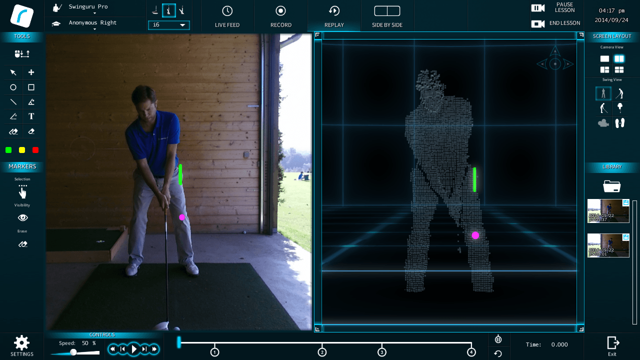 - Record ideal student’s swing positions, then let the student train and feel the right move by matching ideal positions during progressive stages with live audio and visual feedback.